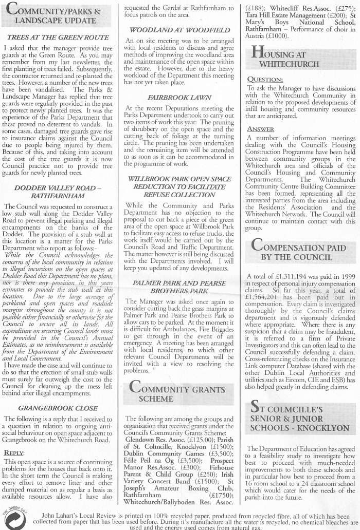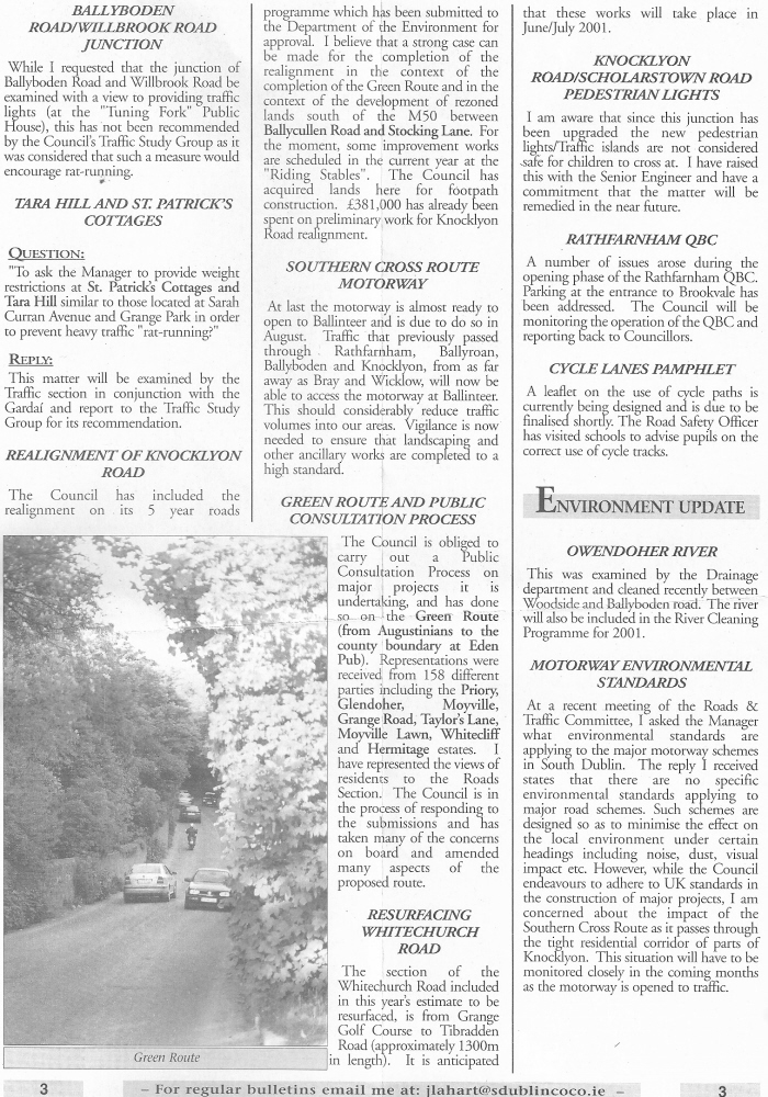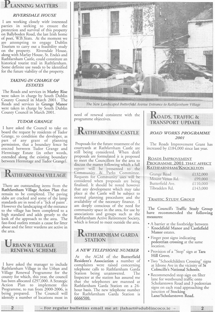 This is most likely of interest to those familiar with the Knocklyon /Rathfarnham area. A 2001 newsletter from Fianna Fail councillor John Lahart.
