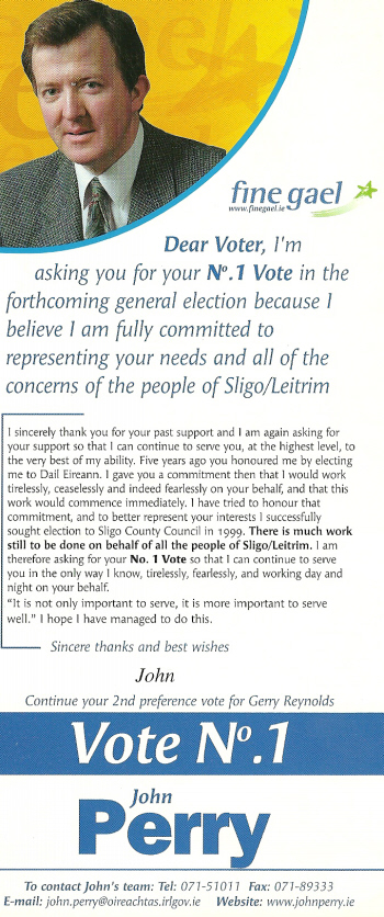 From the 2002 General Election a flyer for Fine Gael Sligo Leitrim candidate John Perry.