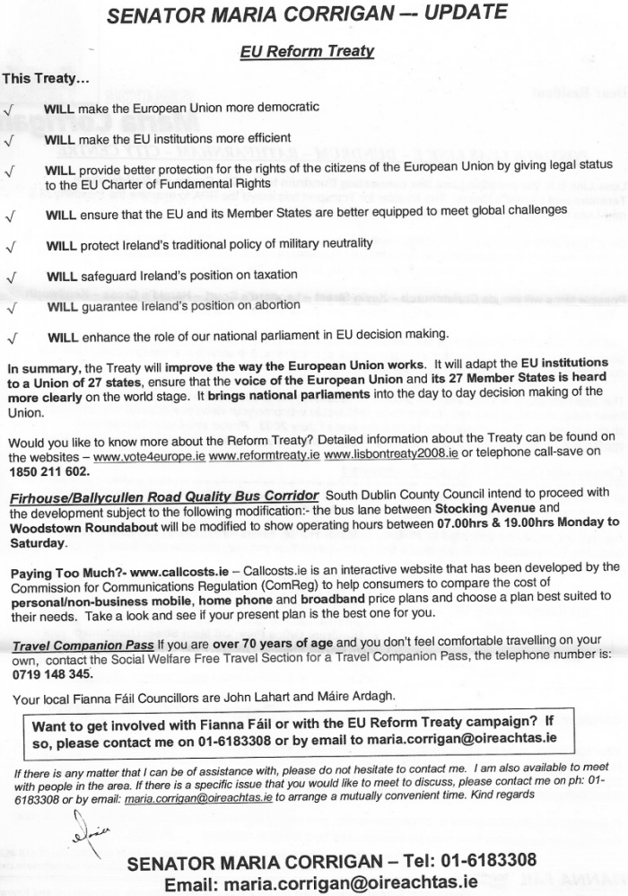 From Fianna Fail Senator Maria Corrigan a 2008 letter to Residents of Dublin South with a headline that would have you believe the LUAS was being built to Rathfarnham. Needless to say it wasn’t quite as positive as the headline suggested.