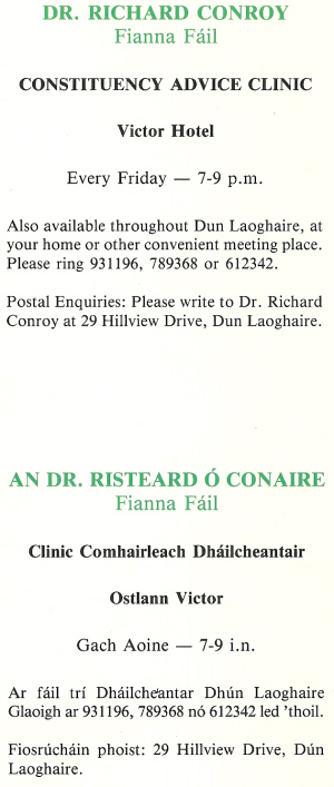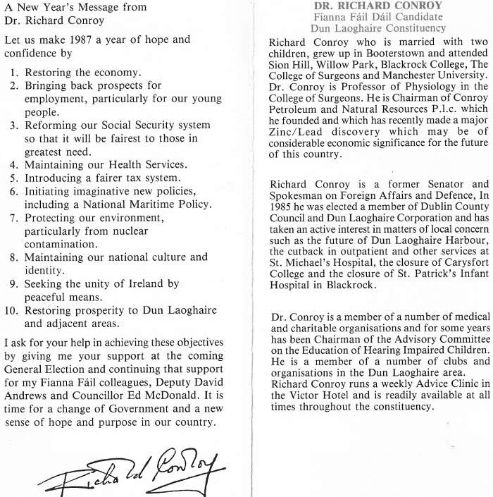 From the run up to the 1987 General Election a Leaflet with Calendar and New Years Message from Fianna Fail Dun Laoghaire candidate Richard Conroy. Conroy had four previous attempts running for Fianna Fail in General Elections and had failed to win a seat. Here in 1987 he polled 2897 votes and again missed out. (His record at Electionsireland.org).