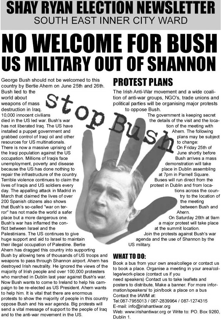 From the 2004 Local Elections an Election Newsletter from Socialist Workers Party Candidate Shay Ryan running in the South East Inner City Ward.