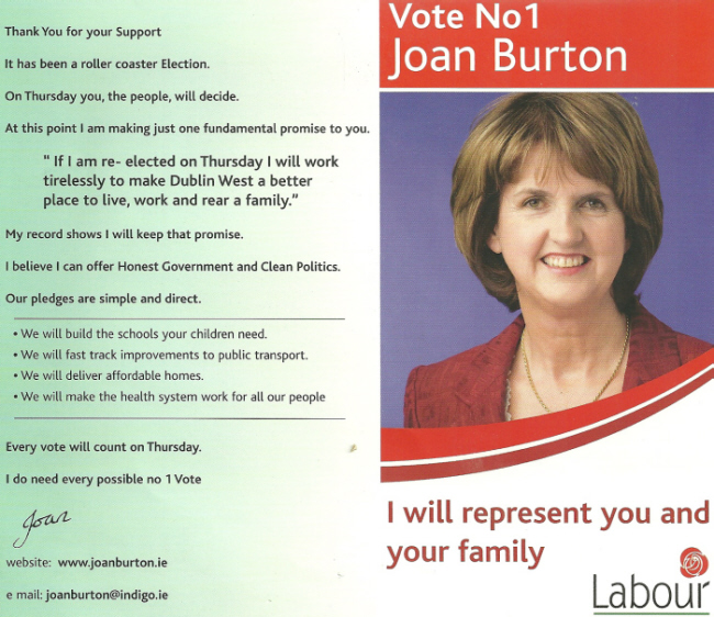 From the 2007 General Election a leaflet from the now Labour Finance Spokesperson Joan Burton. Burton polled 5,799 votes and took the final seat.