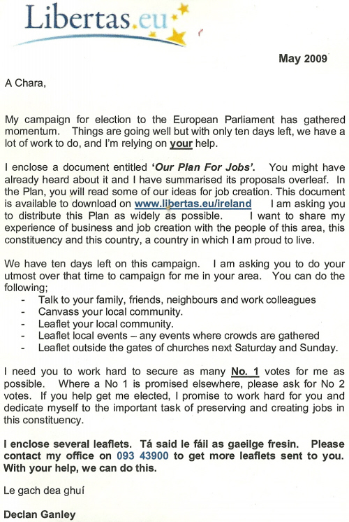 Declan Ganley Letter to Canvassers 2009 European Elections » libcanvassjobs