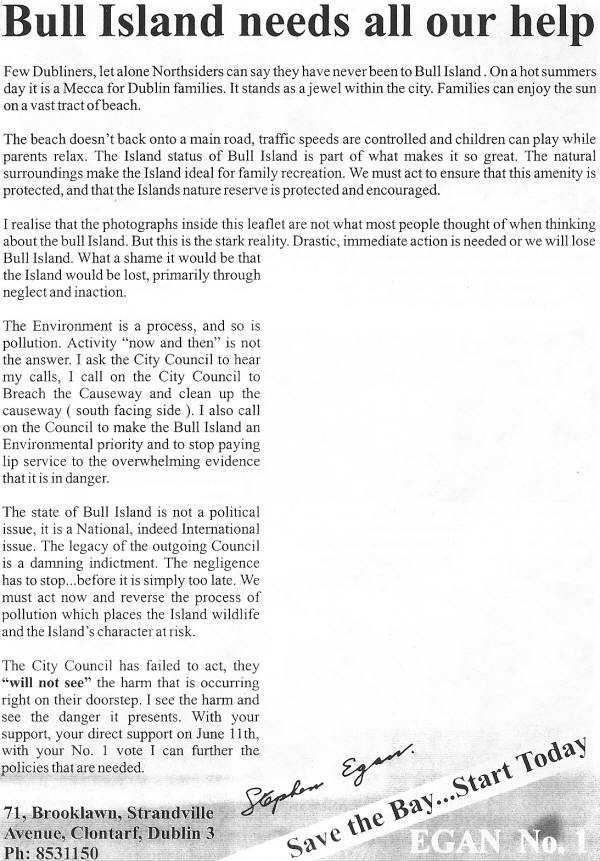 Leaflet about pollution on Bull Island- Stephen Egan -Fianna Fail -1999 Local Elections Clontarf » segan99d