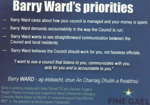 From the 2009 Local Elections a Sorry I Missed You Card from Fine Gael candidate Barry Ward running in Blackrock.