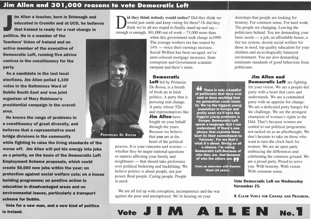 Jim Allen -Democratic Left -1992 General Election Dublin South East » jimallen92b