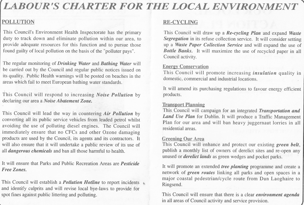 ‘Labours Charter to protect our Local Environment’ -Niamh Bhreathnach 1991 Local Elections Blackrock » nbreathnach91b