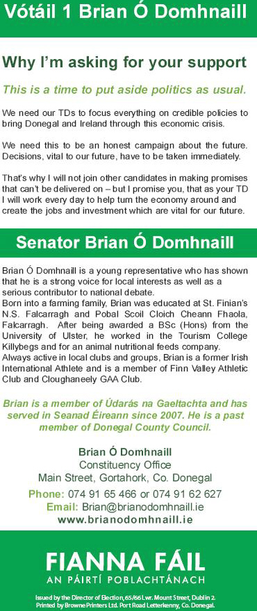 Flyer for Brian O’ Domhnaill – Fianna Fail 2010 Donegal South West By-Election » odomh2
