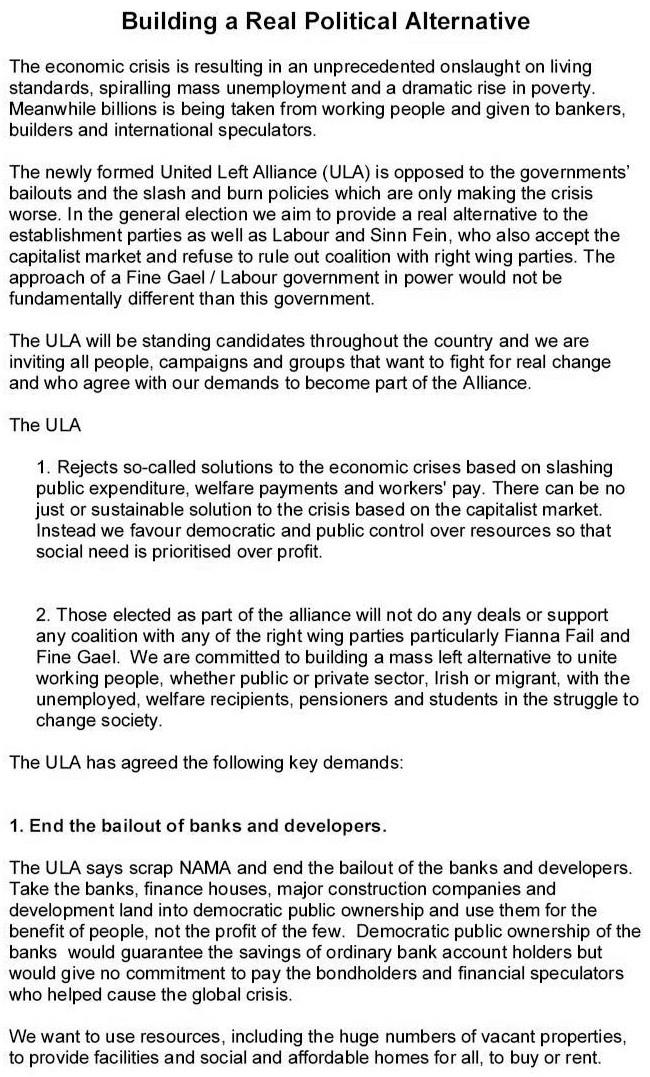 The Statement agreed at the foundation of the United Left Alliance (ULA) Ireland November 16, 2010