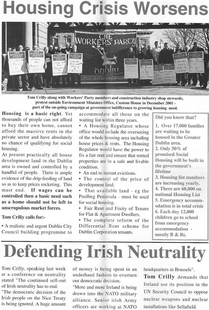 From the 2002 General Election campaign a newsletter from Workers Party candidate Tom Crilly. Bin Charges, the Health Service, The Incinerator and Irish Neutrality are amongst the items covered.