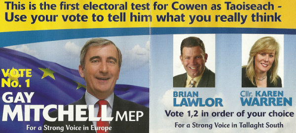 From the 2009 Local Elections in Tallaght South a flyer for Fine Gael candidates Brian Lawlor and Karren Warren. Lawlor won a seat whilst Karren Warren was unsuccessful.