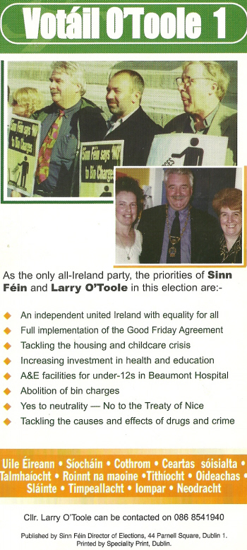 Flyer For Larry O’Toole -Sinn Fein -2002 GE Dublin North East » lotoole02b