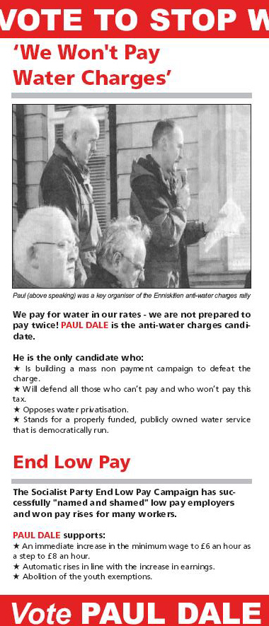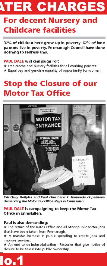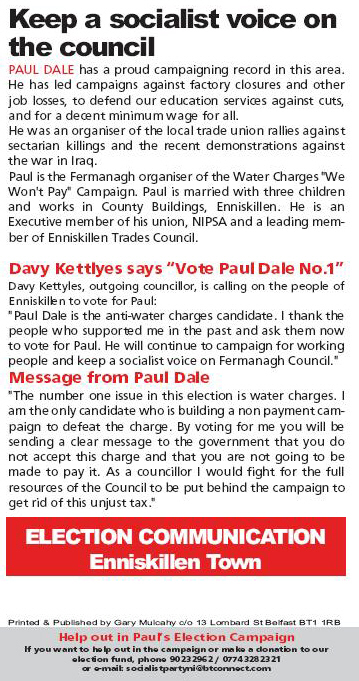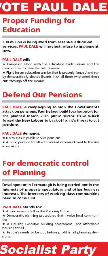 From the 2005 Local elections a leaflet for Socialist Party candidate Paul Dale running in the Enniskillen ward for Fermanagh District Council.