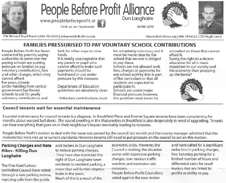 The “People Before Profit Alliance Dun Laoghaire Newsletter” from Winter 2010. Pictured on the newsletter are PBP Councillors Richard Boyd Barrett and Hugh Lewis.