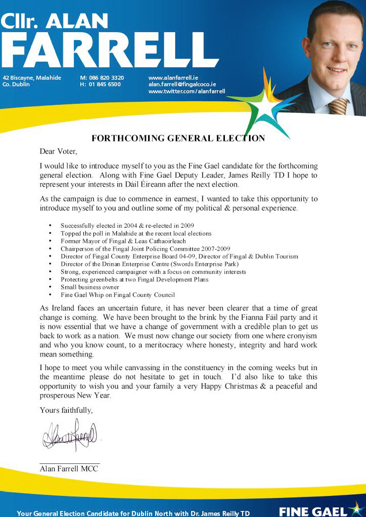 Letter from Alan Farrell introducing himself to voters- Fine Gael Dublin North 2011 GE December 22, 2010