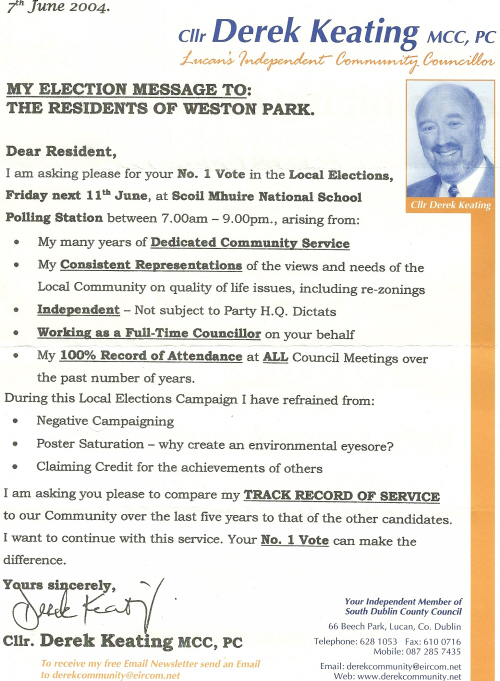 Flyer for Derek Keating -Independent (Now Fine Gael) -2004 Local Elections Lucan » dkeating04a