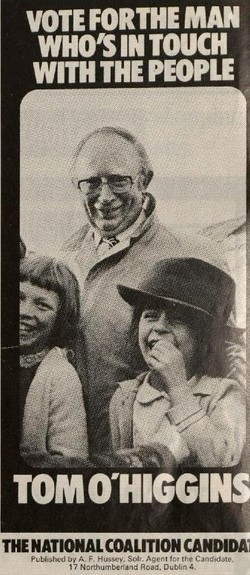 From the 1973 Presidential Election an ad for the National Coalition (Fine Gael) candidate Tom O’Higgins who polled 587,771 votes losing out to Erskine Childers.