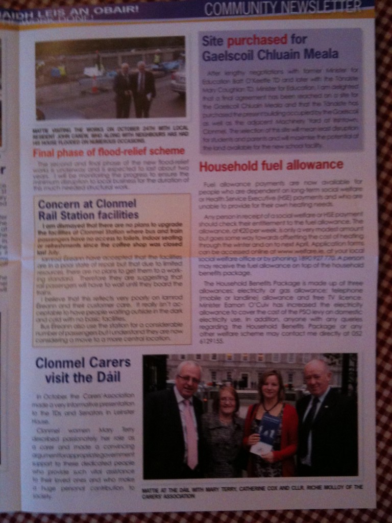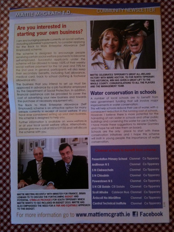 One Response to “Independent Mattie McGraths Election Newsletter -2011 General Election Tipperary South”