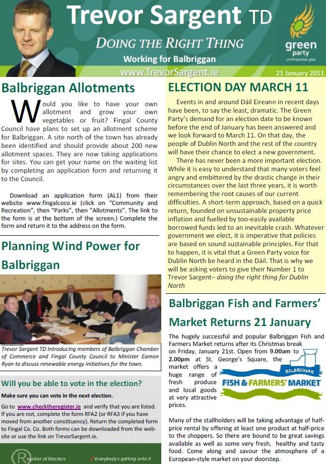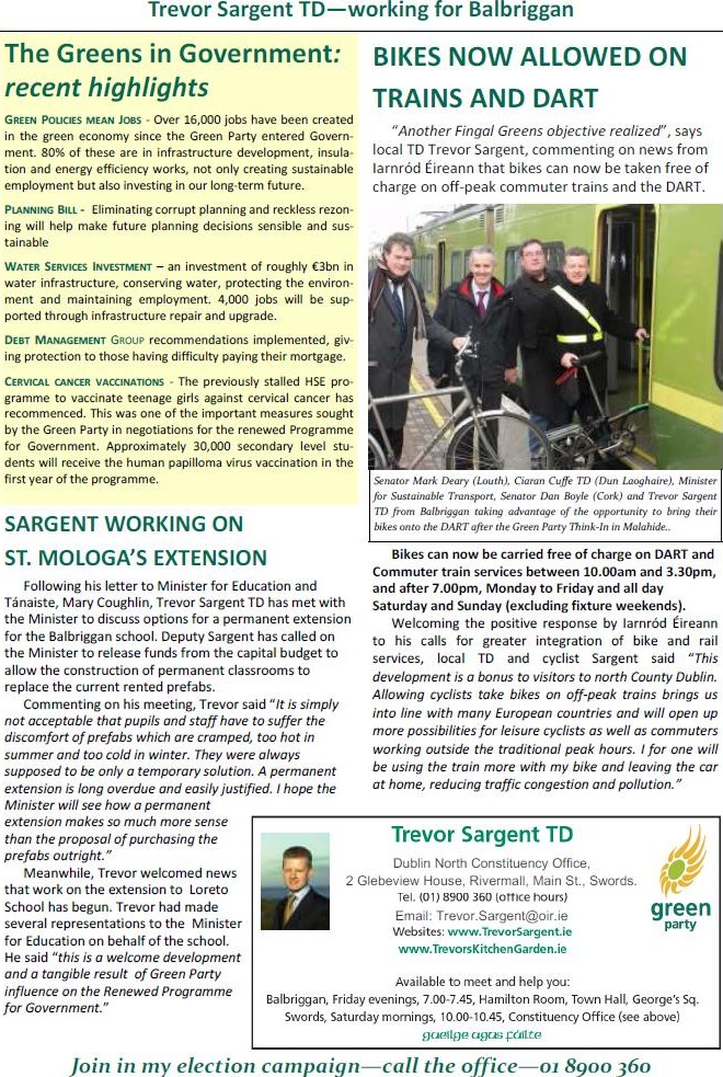 From the 2011 General Election a Balbriggan focused leaflet from Green Party TD for Dublin North Trevor Sargent.