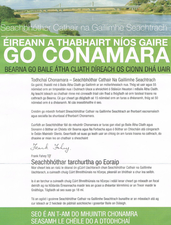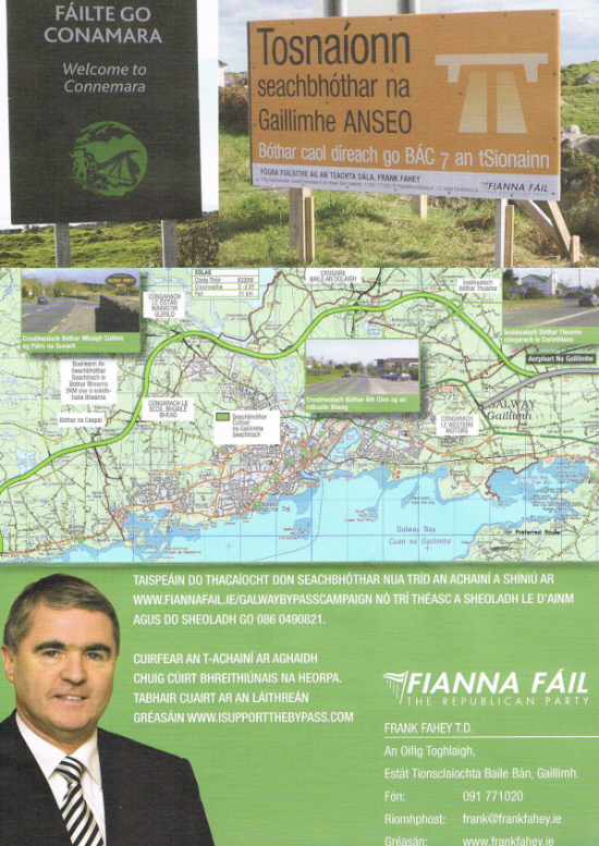 From the 2011 General Election Campaign a leaflet from Fianna Fail Galway West candidate Frank Fahey. The leaflet focuses on the Galway Bypass.