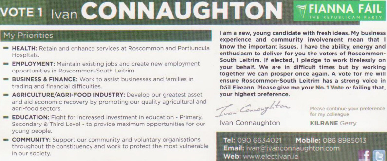 From the 2011 General Election a flyer for Fianna Fail candidate Ivan Connaughton running in Roscommon South Leitrim.