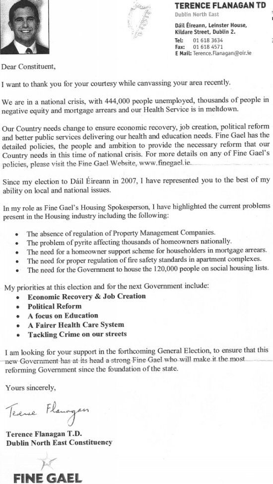 Letter from Fine Gaels Terence Flanagan to voters in Dublin North East -2011 General Election » tflanaghanletter11