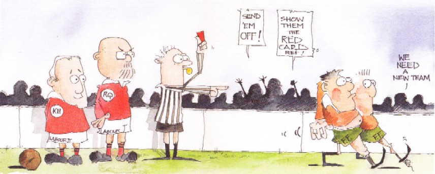 From the 2011 General Election Campaign a wonderful flyer from Labour Party candidates in Dublin South East Ruairi Quinn and Kevin Humphreys. I’m trying to figure out who the two FF players may be.