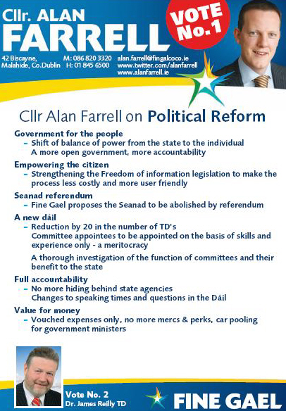 From the 2011 General Election campaign a leaflet focusing on Political Reform from Fine Gael candidate in Dublin North Alan Farrell.