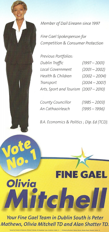 From the 2011 General Election Campaign a flyer from Fine Gael candidate in Dublin South Olivia Mitchell. The picture on the reverse of the flyer is one she used in her 2007 election campaign.