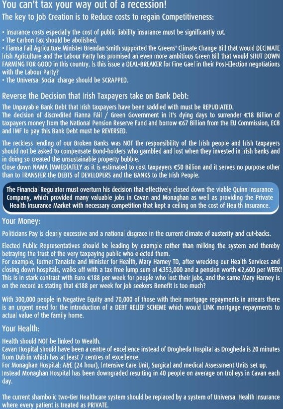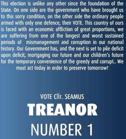 1. […] This post was mentioned on Twitter by Shane and Electionlit, Paul McPhillips. Paul McPhillips said: Sweet Jesus, save us from people like Treanor: Leaflet for Seamus Treanor -Independent -Cavan Monaghan: http://t.co/FxUZFow […]