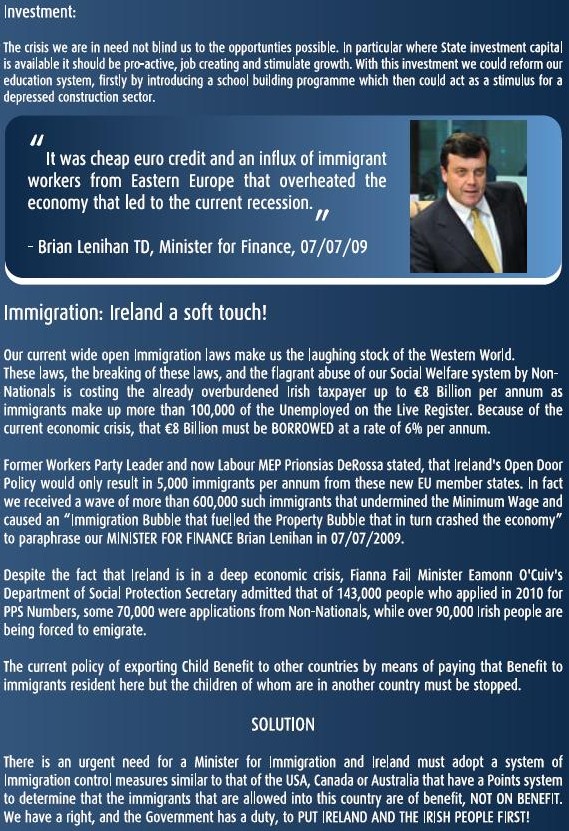 Treanor’s 2011 electoral leaflet is a disgrace and an insult to every decent person living in Ireland. It is a clear attack on citizens of the European Union and should be classed as incitement to racial hatred which is a crime in every civilized country in the world.