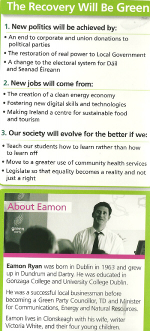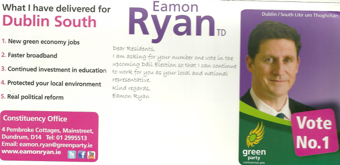 From the 2011 General Election Campaign a leaflet from Green Party candidate Eamon Ryan running in Dublin South. First elected in 2002, Ryan is under pressure to hold on to his seat.