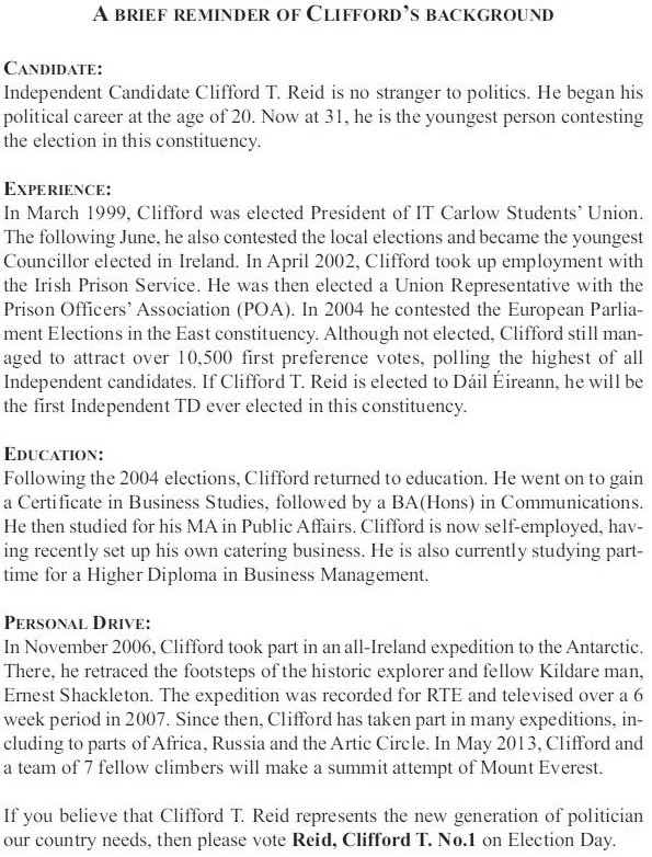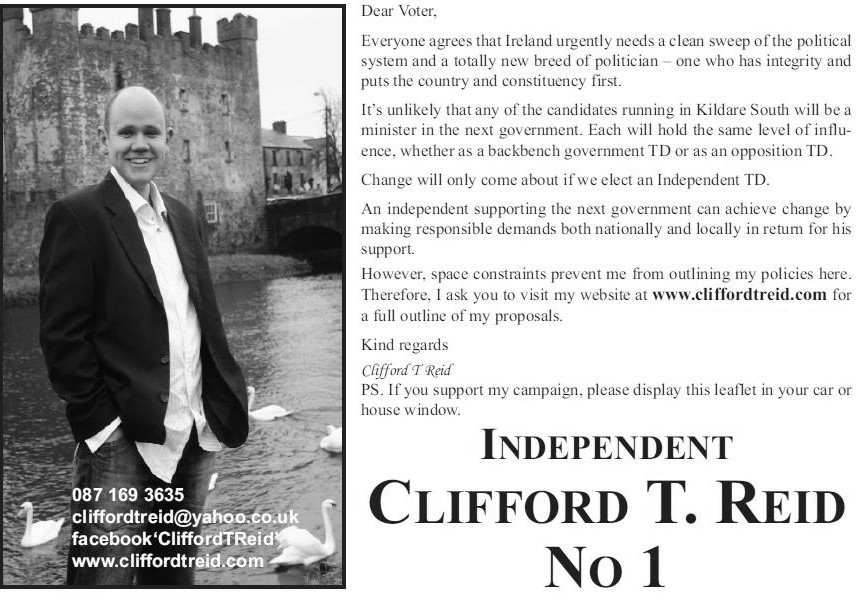 From the 2011 General Election campaign a leaflet from Independent candidate Clifford T Reid running in Kildare South. Reid of “Stop The Paedophiles” fame has been to the Antarctic since his 2004 campaign and plans to conquer Everest in 2013.