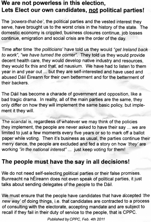 From the 2011 General Election a leaflet for Patrick Bullman and Claire Cullinane running for An Chomhdháil Phobail I The People’s Convention (CPPC) in Cork East.