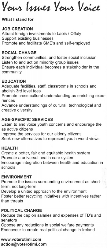 From the 2011 General Election campaign a flyer from Independent candidate Rotimi Adebari running in Laois Offaly. In 2004 Rotimi Adebari was elected to Portlaoise Town Council and served as Mayor in 2007.