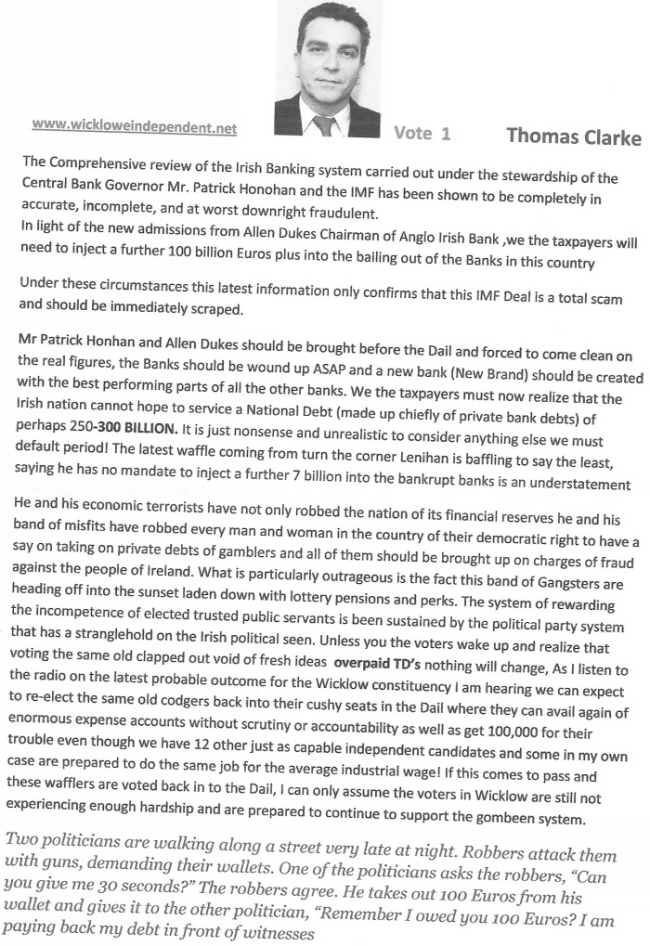 Leaflet from Thomas Clarke -Independent -Wicklow -2011 General Election » tclarke