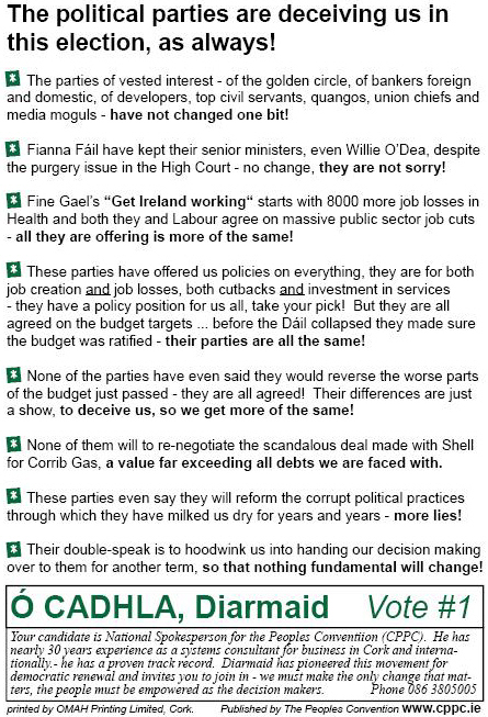 Leaflet from Diarmaid Ó Cadhla- An Chomhdháil Phobail | The Peoples Convention (CPPC)- Cork South Central February 22, 2011