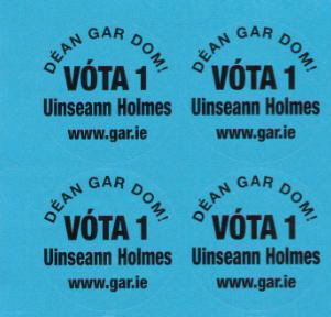 Stickers from Galway West Independent candidate Uinseann Holmes. It is his first time standing for Election.