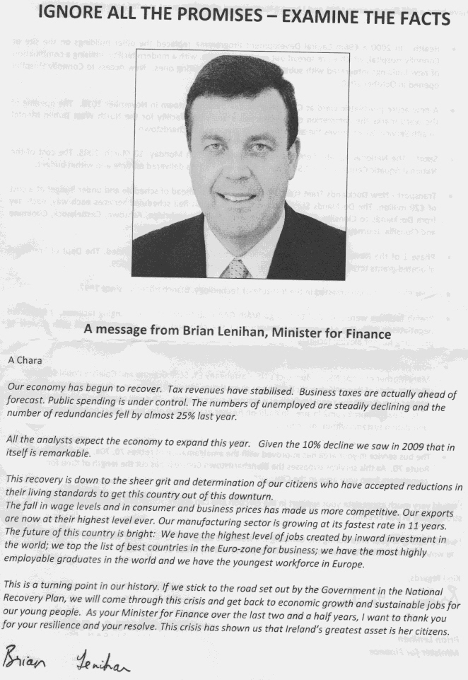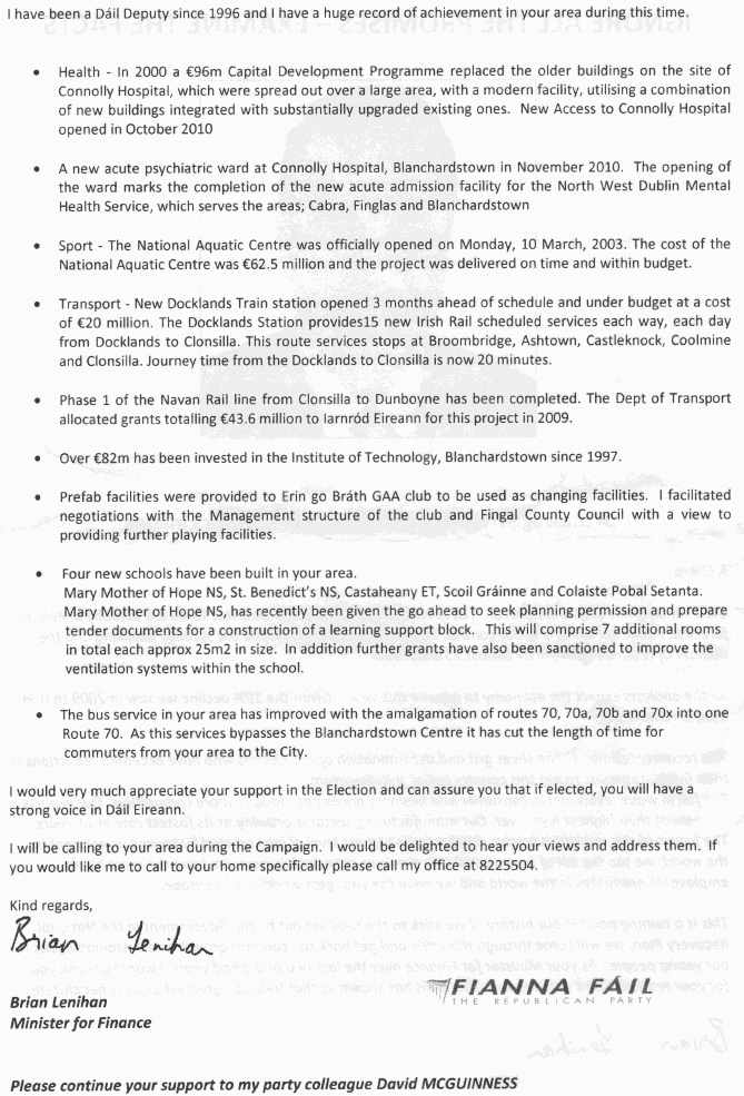 “Ignore All The Promises – Examine The Facts” asks Fianna Fails Brian Lenihan in this letter to voters from the 2011 General Election campaign. He writes that we’ve in effect turned the corner and also lists where monies were distributed locally.