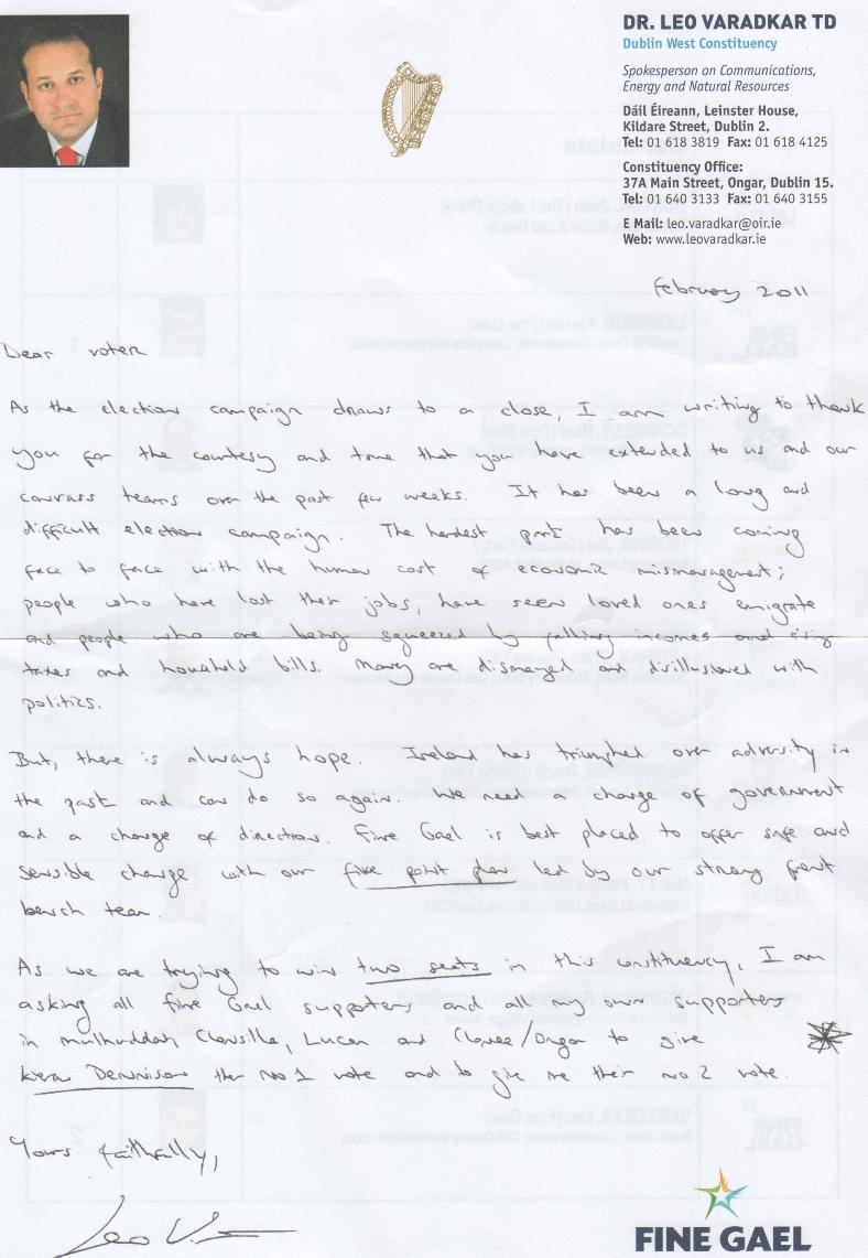 Letter and email from Leo Varadkar -Fine Gael -Dublin West February 24, 2011