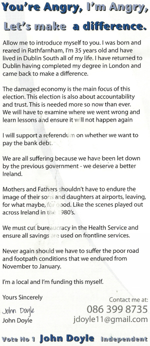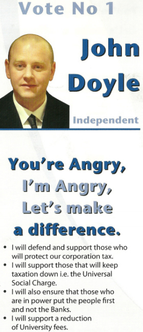 “You’re Angry, I’m Angry, Let’s make a difference.” the slogan of Independent candidate John Doyle running in Dublin South in the 2011 General Election.