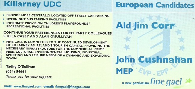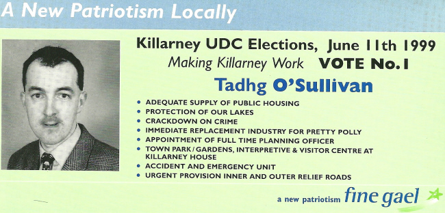 From the 1999 Local Elections a flyer for Fine Gael candidate Tadgh O’Sullivan running for Killarney UDC. O’Sullivan polled 192 votes and failed to win a seat.
