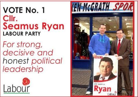 From the 2011 General Election campaign an ad for Seamus Ryan running for the Labour Party in Waterford. The Waterford City based councillor is pictured with Waterford hurling star Ken McGrath outside McGraths sports shop in Georges Street in Waterford.