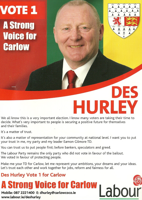 From the 2011 General election a flyer for long standing Labour councillor Des Hurley running in Carlow Kilkenny. The Carlow based Hurley polled 3,908 votes and failed to win a seat. His party colleague, the Kilkenny based Ann Phelan was elected.