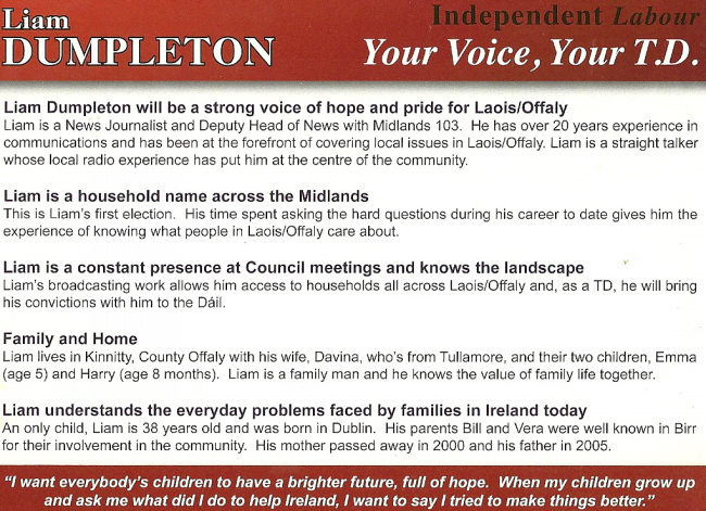 Flyer for Liam Dumpleton -Independent -Laois Offaly 2011 GE » ldumpletonb