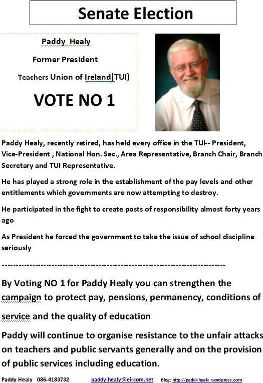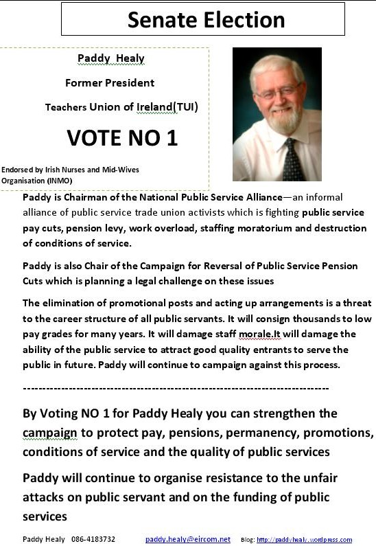 From the 2011 NUI Seanad Elections some posters from Independent candidate Paddy Healy.