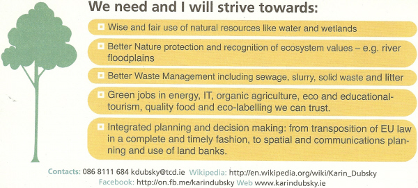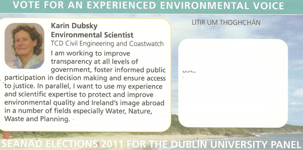 From the 2011 Seanad Elections a flyer from Karin Dubsky who is not actually running for a seat on the Trinity Panel. She withdrew from the race when she discovered that she wasn’t an Irish citizen.