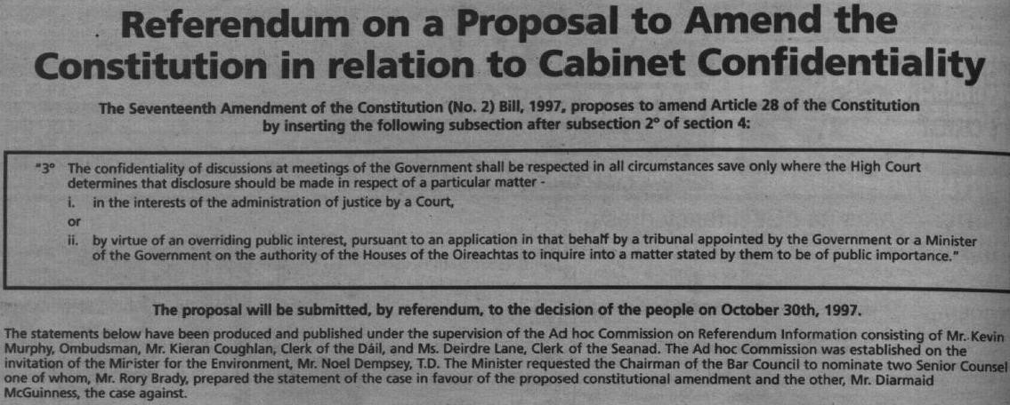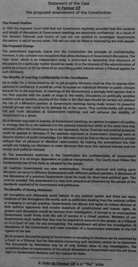 Had this lying about at home, an Ad from the 1997 Referendum on Cabinet Confidentiality produced by a predecessor of the Referendum Commission. The Referendum was passed by a narrowish margin. 52.65% Voted Yes and 47.35% voted No.