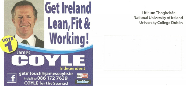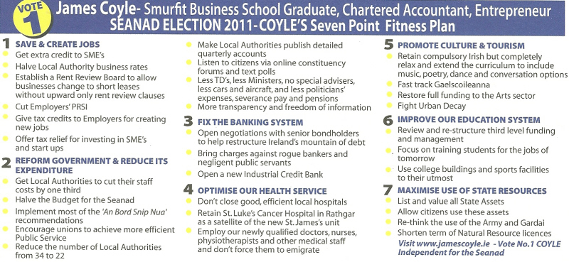 From the 2011 Seanad Election a flyer for James Coyle who is running for a seat on the NUI panel. Coyle stood in Dublin South East gaining 164 votes. He ran as an “Independent Accountant for the Dail”