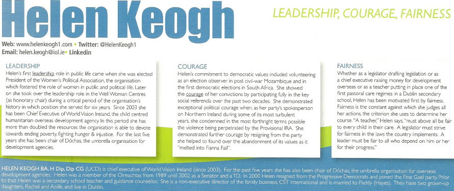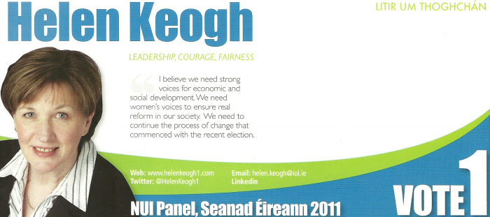 From the 2011 Seanad Elections for the NUI panel a leaflet from Helen Keogh. Keogh a former PD TD and Senator (some of her old election leaflets here , here and here) ,also had a spell in Fine Gael.